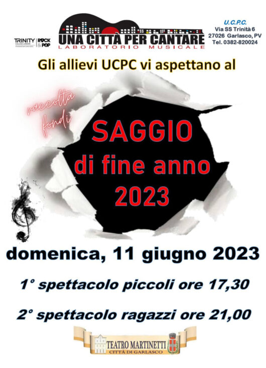 UCPC – Saggio di fine Anno 2022/2023 – Garlasco (PV) Posted on 26 Giugno, 202326 Giugno, 2023 by ruggero Domenica 11 Giugno 2023 Primo spettacolo piccoli: Ore 17.30 Secondo spettacolo ragazzi: Ore 21.00 Teatro Martinetti – Garlasco (PV)