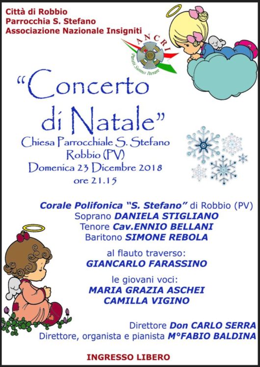 Corale Polifonica di Robbio – Concerto di Natale Posted on 7 Dicembre, 20187 Dicembre, 2018 by ruggero Domenica, 23 Dicembre 2018 Ore 21:15 Chiesa Parrochiale S. Stefano – Robbio (PV) Ingresso Libero