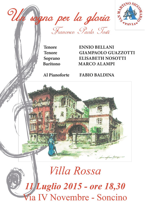Concerto “Un Sogno Per La Gloria” – Soncino Posted on 3 Luglio, 20153 Luglio, 2015 by ruggero Concerto “Un Sogno Per La Gloria” – Francesco Paolo Tosti. Sabato, 11 luglio 2015 Ore 18.30 Villa Rossa – Via IV Novembre, Soncino
