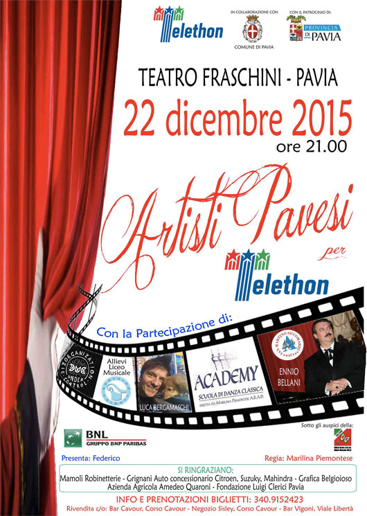 Artisti Pavesi per Telethon – Teatro Fraschini – Pavia Posted on 22 Dicembre, 201522 Dicembre, 2015 by ruggero Martedì 22 Dicembre 2015 Ore 21.00 Teatro Fraschini – Pavia